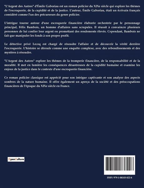 "L'Argent des Autres" d'Émile Gaboriau est un roman policier du XIXe siècle qui explore les thèmes de l'escroquerie, de la cupidité et de la justice. L'auteur, Émile Gaboriau, était un écrivain français considéré comme l'un des précurseurs du genre policier. L'intrigue tourne autour d'une escroquerie financière élaborée orchestrée par le personnage principal, Félix Bambois, un homme d'affaires sans scrupules. Il réussit à convaincre plusieurs personnes de lui confier leur argent en promettant des rendements élevés. Cependant, Bambois ne fait que manipuler les fonds à son propre profit. Le détective privé Lecoq est chargé de résoudre l'affaire et de découvrir la vérité derrière l'escroquerie. L'histoire se déroule comme une enquête complexe, avec des rebondissements et des mystères à résoudre. "L'Argent des Autres" explore les thèmes de la tromperie financière, de la responsabilité et de la moralité. Il met en lumière les conséquences désastreuses de la cupidité humaine et examine les enjeux de la justice dans le contexte d'une escroquerie financière. Ce roman policier classique est apprécié pour son intrigue captivante et son analyse des aspects sombres de la nature humaine. Il offre également un aperçu de la société et des préoccupations financières de l'époque du XIXe siècle en France.