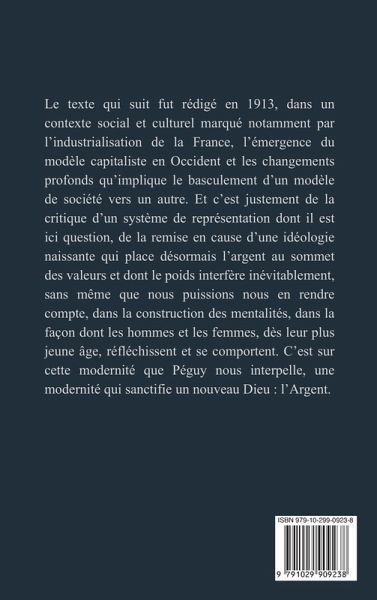Le texte qui suit fut rédigé en 1913, dans un contexte social et culturel marqué notamment par l'industrialisation de la France, l'émergence du modèle capitaliste en Occident et les changements profonds qu'implique le basculement d'un modèle de société vers un autre. Et c'est justement de la critique d'un système de représentation dont il est ici question, de la remise en cause d'une idéologie naissante qui place désormais l'argent au sommet des valeurs et dont le poids interfère inévitablement, sans même que nous puissions nous en rendre compte, dans la construction des mentalités, dans la façon dont les hommes et les femmes, dès leur plus jeune âge, réfléchissent et se comportent. C'est sur cette modernité que Péguy nous interpelle, une modernité qui sanctifie un nouveau Dieu : l'Argent.