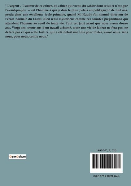 L'Argent est un essai en deux parties de Charles Péguy publié d'abord dans les Cahiers de la quinzaine à partir de février 1913. Contexte historique de l'¿uvre : En décembre 1912, Charles Péguy entreprend d'écrire un avant-propos à une étude sur « l'enseignement primaire et ce qu'il devrait être » : il reprend pour cet avant-propos un titre de Jules Vallès et de Zola, L¿Argent. C'est à cette époque qu'il apprend la véritable identité du signataire d'un article qui avait, en juillet 1911, attaqué violemment ses ¿uvres choisies. L'auteur de cette critique, Charles-Victor Langlois, professeur à la Sorbonne avait, à mots à peine couverts, accusé Charles Péguy d'avoir célébré Jeanne d'ArcNote pour obtenir « l'applaudissement, l'appui moral et, au besoin ¿temporel¿ » du parti catholique1; accuser Péguy de vénalité alors qu'il souffrait d'une situation financière très dégradée, désespérant même de pouvoir faire vivre sa famille, et qu'il venait de susciter la méfiance de l'Église catholique après sa conversion religieuse, était ce qui pouvait le plus blesser son désintéressement. Le polémiste qu'est Péguy règle aussitôt ses comptes avec Langlois et avec la Sorbonne à la suite de ce qu'il a déjà rédigé de son avant-propos. Puis il poursuit la rédaction de l'Argent pour régler ses comptes avec les tenants de la réforme de l'enseignement de 1902, en particulier avec Gustave Lanson, le pourfendeur de la Ligue pour la culture française, ancien collaborateur de Jaurès à L'Humanité et partisan de l'application des méthodes scientifiques aux études littéraires ; Péguy s'attaque également à Ernest-Charles Babut, Charles Seignobos et Ernest Lavisse. L'ensemble des textes écrits par Péguy entre décembre 1912 et avril 1913 sur ces questions relatives à l'enseignement constituent L'Argent et L'Argent suite qui ont été publiés respectivement dans les sixième et neuvième Cahiers de la quinzaine, en 1913.
