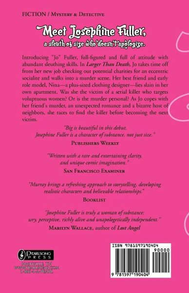 Meet Josephine Fuller, a sleuth of size who doesn't apologize. Larger Than Death introduces "Jo" Fuller, full-figured and full of attitude with abundant sleuthing skills. In Larger Than Death Joe takes time off from her new job checking out potential charities for an eccentric socialite and walks into a murder scene. Her best friend and early role model, Nina -- a plus-sized clothing designed -- lies slain in her own apartment. Was she the victim of a serial killer who targets voluptuous women? or is the murder personal? As Jo copes with her friend's murder, an unexpected romance and a bizarre host of neighbors, she races to find the killer before becoming the next victim.