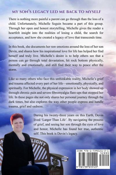 There is nothing more painful a parent can go through than the loss of a child. Unfortunately, Michelle Seguin became a part of this group. Through her open and honest storytelling, Michelle gives the reader a heartfelt insight into the realities of losing a child, the search for acceptance, and how she created a legacy of love that transcends time. In this book, she documents her raw emotions around the loss of her son Devin, and shares how his inspirational love for life has helped her find herself and truly live. Michelle's desire is to help others see that a person can go through total devastation, hit rock bottom physically, mentally and emotionally, and still find their way to peace after the storm. Like so many others who face this unthinkable reality, Michelle's grief and trauma affected every part of her life-emotionally, physically, and spiritually. For Michelle, the physical expression in her body showed up through chronic pain and severe fibromyalgia flare-ups that stopped her life. In these pages she not only shares her personal journey through the dark times, but also explores the way other people express and handle trauma, grief and sadness. During his twenty-three years on this Earth, Devin lived 'Larger Than Life'. By navigating the process of grief, and seeing her son through the eyes of love and honor, Michelle has found her true, authentic self. This book is Devin's legacy.