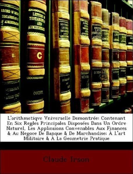 L'arithmetiqve Vniverselle Demontrée by Claude Irson, published in 1674, is a comprehensive treatise on arithmetic. This historical work, subtitled 'Contenant En Six Regles Principales Disposées Dans Un Ordre Naturel, Les Applicaions Convenables Aux Finances & Au Negoce De Banque & De Marchandise; à L'art Militaire & à la Geometrie Pratique', presents arithmetic within six principal rules. It offers applications suitable for finance, banking, trade, military arts, and practical geometry. This book provides insight into the mathematical knowledge and practices of the 17th century, particularly regarding its use in finance and military applications. It stands as a valuable resource for those interested in the history of mathematics and its practical applications during this period. This work has been selected by scholars as being culturally important, and is part of the knowledge base of civilization as we know it. This work was reproduced from the original artifact, and remains as true to the original work as possible. Therefore, you will see the original copyright references, library stamps (as most of these works have been housed in our most important libraries around the world), and other notations in the work. This work is in the public domain in the United States of America, and possibly other nations. Within the United States, you may freely copy and distribute this work, as no entity (individual or corporate) has a copyright on the body of the work. As a reproduction of a historical artifact, this work may contain missing or blurred pages, poor pictures, errant marks, etc. Scholars believe, and we concur, that this work is important enough to be preserved, reproduced, and made generally available to the public. We appreciate your support of the preservation process, and thank you for being an important part of keeping this knowledge alive and relevant.
