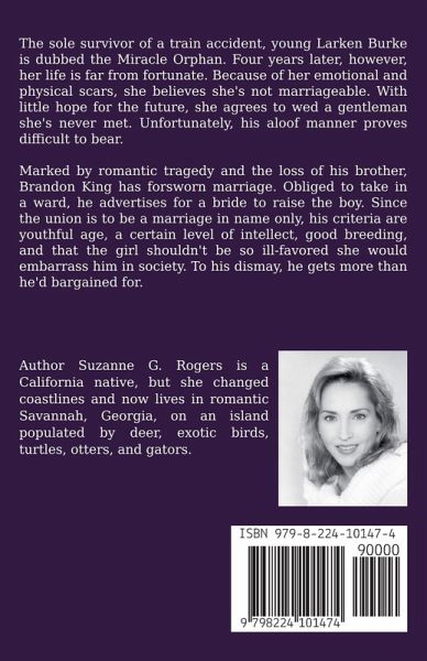 The sole survivor of a train accident, young Larken Burke is dubbed the Miracle Orphan. Four years later, however, her life is far from fortunate. Because of her emotional and physical scars, she believes she's not marriageable. With little hope for the future, she agrees to wed a gentleman she's never met. Unfortunately, his aloof manner proves difficult to bear. Marked by romantic tragedy and the loss of his brother, Brandon King has forsworn marriage. Obliged to take in a ward, he advertises for a bride to raise the boy. Since the union is to be a marriage in name only, his criteria are youthful age, a certain level of intellect, good breeding, and that the girl shouldn't be so ill-favored she would embarrass him in society. To his dismay, he gets more than he'd bargained for. Will it take a miracle for Mr. and Mrs. King to fall in love, or is their marriage another accident waiting to happen? A clean & wholesome Victorian romance with a touch of melodrama.