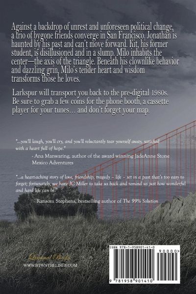 Against a backdrop of unrest and unforeseen political change, a trio of bygone friends converge in San Francisco. Jonathan is haunted by his past and can't move forward. Kit, his former student, is disillusioned and in a slump. Milo inhabits the center-the axis of the triangle. Beneath his clownlike behavior and dazzling grin, Milo's tender heart and wisdom transforms those he loves. Larkspur will transport you back to the pre-digital 1980s. Be sure to grab a few coins for the phone booth, a cassette player for your tunes... and don't forget your map.