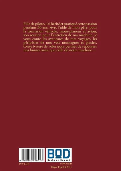 Fille de pilote, j'ai hérité et pratiqué cette passion pendant 30 ans. Avec l'aide de mon père, pour la formation vélivole, moto-planeur et avion, son soutien pour l'entretien de ma machine, je vous conte les aventures de mes voyages, les péripéties de mes vols montagnes et glacier. Cette ivresse de voler nous permet de repousser nos limites ainsi que celle de notre machine ...
