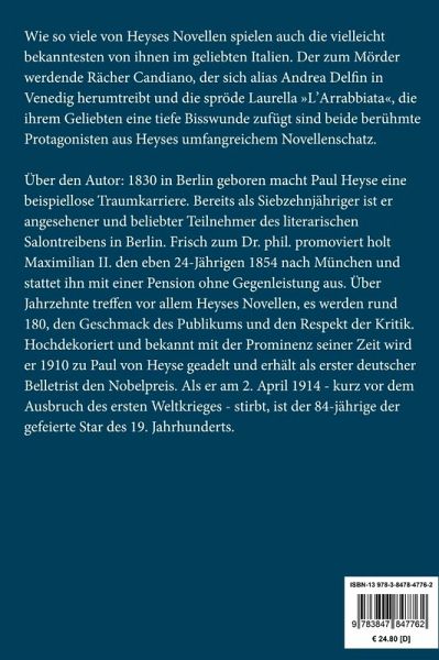 Paul Heyse: L'Arrabbiata / Andrea Delfin. Zwei Erzählungen Lesefreundlicher Großdruck in 16-pt-Schrift Wie so viele von Heyses Novellen spielen auch die vielleicht bekanntesten von ihnen im geliebten Italien. Der zum Mörder werdende Rächer Candiano, der sich alias Andrea Delfin in Venedig herumtreibt und die spröde Laurella »L'Arrabbiata«, die ihrem Geliebten eine tiefe Bisswunde zufügt sind beide berühmte Protagonisten aus Heyses umfangreichem Novellenschatz. Großformat, 210 x 297 mm Berliner Ausgabe, 2020 Durchgesehener Neusatz mit einer Biographie des Autors bearbeitet und eingerichtet von Theodor Borken L' Arrabbiata: Entstanden: 1853. Erstdruck: Berlin (Hertz) 1855 in: Novellen 1. Sammlung. Bd. 17. Andrea Delfin: Entstanden: 1859: Erstdruck: Berlin [o. V.] 1862. Viele Heyses Novellen wurden vor allem in Zeitschriften wie »Die Gartenlaube«, »Westermanns Monatshefte« u. »Deutsche Rundschau« schon vor dem Erscheinen in einem Band veröffentlicht. Textgrundlage ist die Ausgabe: Paul Heyse: Werke mit einem Essay von Theodor Fontane herausgegeben von Bernhard und Johanna Knick, Hildegard Korth, 2 Bände, Frankfurt am Main: Insel, 1980. Die Paginierung obiger Ausgabe wird in dieser Neuausgabe als Marginalie zeilengenau mitgeführt. Umschlaggestaltung von Thomas Schultz-Overhage unter Verwendung des Bildes: Francesco Albotto, Ansicht des Canal Grande in Venedig, um 1750. Gesetzt aus der Minion Pro, 16 pt. Über den Autor: 1830 in Berlin geboren macht Paul Heyse eine beispiellose Traumkarriere. Bereits als Siebzehnjähriger ist er angesehener und beliebter Teilnehmer des literarischen Salontreibens in Berlin. Frisch zum Dr. phil. promoviert holt Maximilian II. den eben 24-Jährigen 1854 nach München und stattet ihn mit einer Pension ohne Gegenleistung aus. Über Jahrzehnte treffen vor allem Heyses Novellen, es werden rund 180, den Geschmack des Publikums und den Respekt der Kritik. Hochdekoriert und bekannt mit der Prominenz seiner Zeit wird er 1910 zu Paul von Heyse geadelt und erhält als erster deutscher Belletrist den Nobelpreis. Als er am 2. April 1914 - kurz vor dem Ausbruch des ersten Weltkrieges - stirbt, ist der 84-jährige der gefeierte Star des 19. Jahrhunderts.