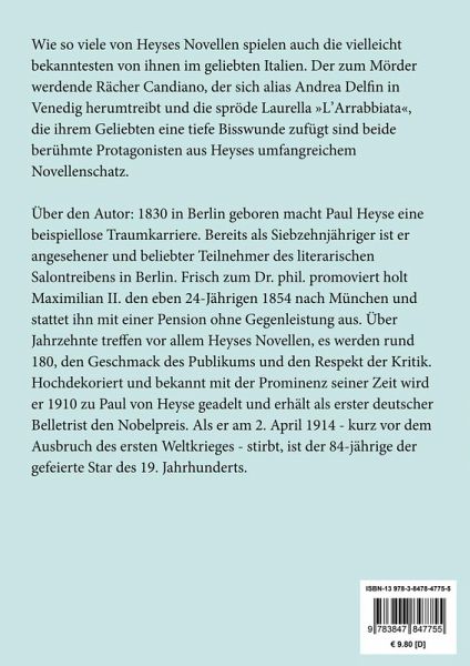 Paul Heyse: L'Arrabbiata / Andrea Delfin. Zwei Erzählungen Lesefreundlicher Großdruck in 16-pt-Schrift Wie so viele von Heyses Novellen spielen auch die vielleicht bekanntesten von ihnen im geliebten Italien. Der zum Mörder werdende Rächer Candiano, der sich alias Andrea Delfin in Venedig herumtreibt und die spröde Laurella »L'Arrabbiata«, die ihrem Geliebten eine tiefe Bisswunde zufügt sind beide berühmte Protagonisten aus Heyses umfangreichem Novellenschatz. Großformat, 210 x 297 mm Berliner Ausgabe, 2020 Durchgesehener Neusatz mit einer Biographie des Autors bearbeitet und eingerichtet von Theodor Borken L' Arrabbiata: Entstanden: 1853. Erstdruck: Berlin (Hertz) 1855 in: Novellen 1. Sammlung. Bd. 17. Andrea Delfin: Entstanden: 1859: Erstdruck: Berlin [o. V.] 1862. Viele Heyses Novellen wurden vor allem in Zeitschriften wie »Die Gartenlaube«, »Westermanns Monatshefte« u. »Deutsche Rundschau« schon vor dem Erscheinen in einem Band veröffentlicht. Textgrundlage ist die Ausgabe: Paul Heyse: Werke mit einem Essay von Theodor Fontane herausgegeben von Bernhard und Johanna Knick, Hildegard Korth, 2 Bände, Frankfurt am Main: Insel, 1980. Die Paginierung obiger Ausgabe wird in dieser Neuausgabe als Marginalie zeilengenau mitgeführt. Umschlaggestaltung von Thomas Schultz-Overhage unter Verwendung des Bildes: Francesco Albotto, Ansicht des Canal Grande in Venedig, um 1750. Gesetzt aus der Minion Pro, 16 pt. Henricus Edition Deutsche Klassik UG (haftungsbeschränkt) Über den Autor: 1830 in Berlin geboren macht Paul Heyse eine beispiellose Traumkarriere. Bereits als Siebzehnjähriger ist er angesehener und beliebter Teilnehmer des literarischen Salontreibens in Berlin. Frisch zum Dr. phil. promoviert holt Maximilian II. den eben 24-Jährigen 1854 nach München und stattet ihn mit einer Pension ohne Gegenleistung aus. Über Jahrzehnte treffen vor allem Heyses Novellen, es werden rund 180, den Geschmack des Publikums und den Respekt der Kritik. Hochdekoriert und bekannt mit der Prominenz seiner Zeit wird er 1910 zu Paul von Heyse geadelt und erhält als erster deutscher Belletrist den Nobelpreis. Als er am 2. April 1914 - kurz vor dem Ausbruch des ersten Weltkrieges - stirbt, ist der 84-jährige der gefeierte Star des 19. Jahrhunderts.