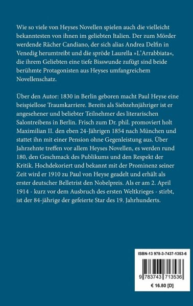 Wie so viele von Heyses Novellen spielen auch die vielleicht bekanntesten von ihnen im geliebten Italien. Der zum Mörder werdende Rächer Candiano, der sich alias Andrea Delfin in Venedig herumtreibt und die spröde Laurella "L'Arrabbiata", die ihrem Geliebten eine tiefe Bisswunde zufügt sind beide berühmte Protagonisten aus Heyses umfangreichem Novellenschatz.