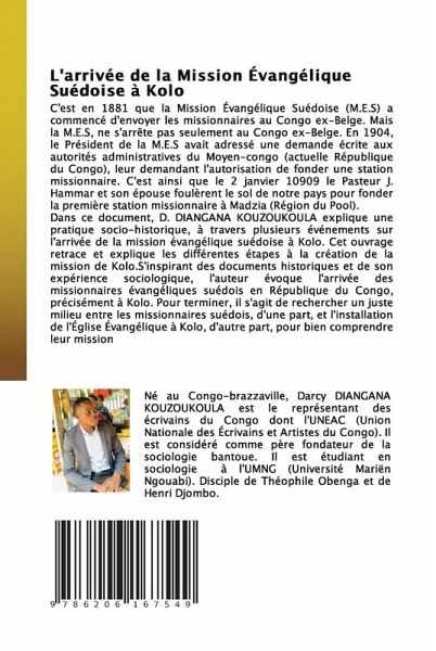 C'est en 1881 que la Mission Évangélique Suédoise (M.E.S) a commencé d'envoyer les missionnaires au Congo ex-Belge. Mais la M.E.S, ne s'arrête pas seulement au Congo ex-Belge. En 1904, le Président de la M.E.S avait adressé une demande écrite aux autorités administratives du Moyen-congo (actuelle République du Congo), leur demandant l'autorisation de fonder une station missionnaire. C'est ainsi que le 2 janvier 10909 le Pasteur J. Hammar et son épouse foulèrent le sol de notre pays pour fonder la première station missionnaire à Madzia (Région du Pool). Dans ce document, D. DIANGANA KOUZOUKOULA explique une pratique socio-historique, à travers plusieurs événements sur l'arrivée de la mission évangélique suédoise à Kolo. Cet ouvrage retrace et explique les différentes étapes à la création de la mission de Kolo.S'inspirant des documents historiques et de son expérience sociologique, l'auteur évoque l'arrivée des missionnaires évangéliques suédois en République du Congo, précisément à Kolo. Pour terminer, il s'agit de rechercher un juste milieu entre les missionnaires suédois, d'une part, et l'installation de l'Église Évangélique à Kolo, d'autre part, pour bien comprendre leur mission