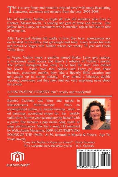 This is a very funny and romantic original novel with fascinating characters, adventure and mystery from the year 2005-2008. Out of boredom, Nadine, a single 48 year old secretary who lives in Chelsea, Massachusetts, is seeking her goal of fame and fortune. Her jealous boss, Larry, an accountant who is married, rejects her idea in fear of losing her. After Larry and Nadine fall madly in love, they have spontaneous sex on the desk in his office and get caught and fired. Larry leaves his wife and moves to Vegas with Nadine where her wacky 70 year old Uncle Willie lives. While in Vegas, Nadine meets a big gambler, Snake, and Larry gets very jealous. Nadine and Snake are living the high life of big fortune and luxury which is part of her goal. Snake suddenly and mysteriously dies, so she wonders what to do next and soon comes up with an idea. Meanwhile, Larry and Nadine make new plans. After awhile, all hell breaks loose from their big parties, another very mysterious death and there is a robbery of Nadine¿s most valuable jewels. Later on, another robbery takes place. The police continue throughout this story to try and find the thief who robbed her jewels and to solve the mysterious death. Nadine gets involved in show business even though Larry rejects her goal in fear of losing her. He later pursues a new career. After she encounters trouble in show business, they take a Beverly Hills, CA vacation and get caught up in movie making. They soon return to Vegas. When the story nears its end, Nadine gets very surprising news about her stolen jewels. She also attends a hilarious double wedding ceremony, and she later has another big jewel surprise. In addition to all of the funny characters, Nadine¿s spontaneous love is a riot and so is Larry¿s love making. LARRY AND NADINE IN VEGAS is a comic romp bursting with one-liners. It¿s wild, wacky and wonderful and filled with laughs from start to finish. This is a funny story that draws you in. IT¿S A FASCINATING COMEDY!
