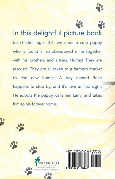 In this delightful picture book for toddlers and children ages 0-6, we meet a cute puppy who is found in an abandoned mine together with his brothers and sisters. Hurray! They are rescued! They are all taken to a farmer's market to find new homes. A boy named Brian happens by, and it's love at first sight. He adopts the puppy, calls him Larry, and takes him to his forever home.