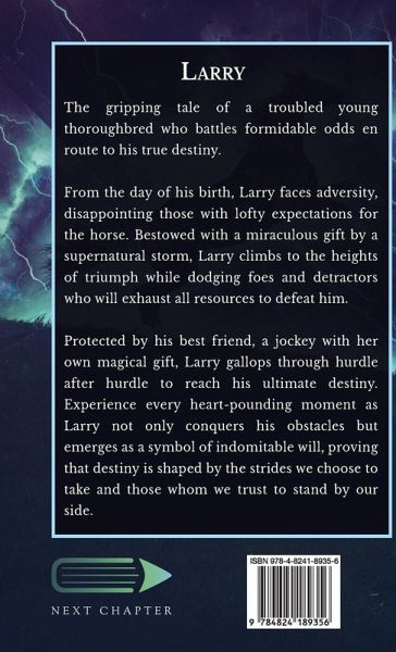 The gripping tale of a troubled young thoroughbred who battles formidable odds en route to his true destiny. From the day of his birth, Larry faces adversity, disappointing those with lofty expectations for the horse. Bestowed with a miraculous gift by a supernatural storm, Larry climbs to the heights of triumph while dodging foes and detractors who will exhaust all resources to defeat him. Protected by his best friend, a jockey with her own magical gift, Larry gallops through hurdle after hurdle to reach his ultimate destiny. Experience every heart-pounding moment as Larry not only conquers his obstacles but emerges as a symbol of indomitable will, proving that destiny is shaped by the strides we choose to take and those whom we trust to stand by our side.