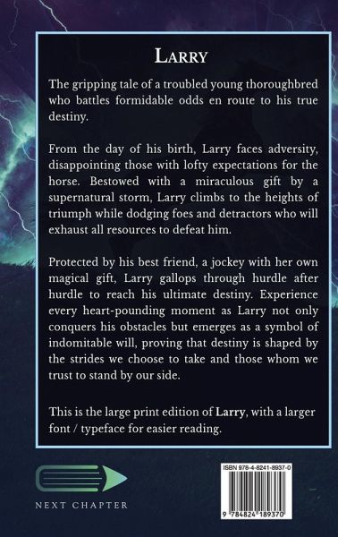 The gripping tale of a troubled young thoroughbred who battles formidable odds en route to his true destiny. From the day of his birth, Larry faces adversity, disappointing those with lofty expectations for the horse. Bestowed with a miraculous gift by a supernatural storm, Larry climbs to the heights of triumph while dodging foes and detractors who will exhaust all resources to defeat him. Protected by his best friend, a jockey with her own magical gift, Larry gallops through hurdle after hurdle to reach his ultimate destiny. Experience every heart-pounding moment as Larry not only conquers his obstacles but emerges as a symbol of indomitable will, proving that destiny is shaped by the strides we choose to take and those whom we trust to stand by our side. This is the large print edition of Larry, with a larger font / typeface for easier reading.