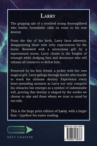 The gripping tale of a troubled young thoroughbred who battles formidable odds en route to his true destiny. From the day of his birth, Larry faces adversity, disappointing those with lofty expectations for the horse. Bestowed with a miraculous gift by a supernatural storm, Larry climbs to the heights of triumph while dodging foes and detractors who will exhaust all resources to defeat him. Protected by his best friend, a jockey with her own magical gift, Larry gallops through hurdle after hurdle to reach his ultimate destiny. Experience every heart-pounding moment as Larry not only conquers his obstacles but emerges as a symbol of indomitable will, proving that destiny is shaped by the strides we choose to take and those whom we trust to stand by our side. This is the large print edition of Larry, with a larger font / typeface for easier reading.