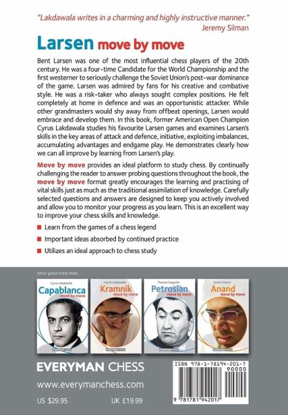 Bent Larsen was one of the most influential chess players of the 20th century. He was a four-time Candidate for the World Championship and the first westerner to seriously challenge the Soviet Union's post-war dominance of the game. Larsen was admired by fans for his creative and combative style. He was a risk-taker who always sought complex positions. He felt completely at home in defence and was an opportunistic attacker. While other grandmasters would shy away from offbeat openings, Larsen would embrace and develop them. In this book, former American Open Champion Cyrus Lakdawala studies his favourite Larsen games and examines Larsen's skills in the key areas of attack and defence, initiative, exploiting imbalances, accumulating advantages and endgame play. He demonstrates clearly how we can all improve by learning from Larsen's play. Move by Move provides an ideal platform to study chess. By continually challenging the reader to answer probing questions throughout the book, the Move by Move format greatly encourages the learning and practising of vital skills just as much as the traditional assimilation of knowledge. Carefully selected questions and answers are designed to keep you actively involved and allow you to monitor your progress as you learn. This is an excellent way to improve your chess skills and knowledge.
