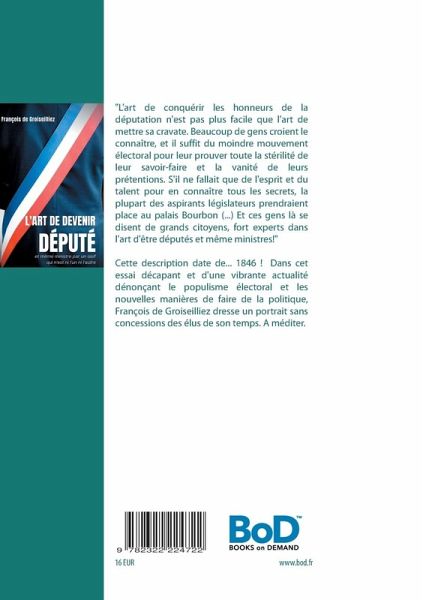 "L'art de conquérir les honneurs de la députation n'est pas plus facile que l'art de mettre sa cravate. Beaucoup de gens croient le connaître, et il suffit du moindre mouvement électoral pour leur prouver toute la stérilité de leur savoir-faire et la vanité de leurs prétentions. S'il ne fallait que de l'esprit et du talent pour en connaître tous les secrets, la plupart des aspirants législateurs prendraient place au palais Bourbon (...) Et je ne parle pas ici de cette industrie vulgaire connue de tous et dont les ressorts sont complètement usés, j'entends par ce mot une science du tact et