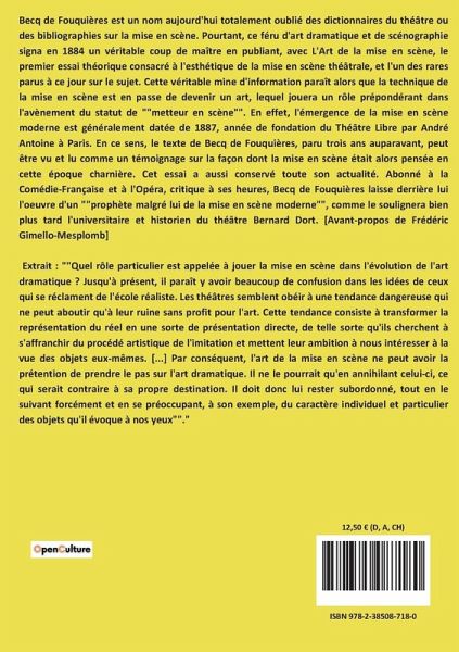 Becq de Fouquières est un nom aujourd'hui totalement oublié des dictionnaires du théâtre ou des bibliographies sur la mise en scène. Pourtant, ce féru d'art dramatique et de scénographie signa en 1884 un véritable coup de maître en publiant, avec L'Art de la mise en scène, le premier essai théorique consacré à l'esthétique de la mise en scène théâtrale, et l'un des rares parus à ce jour sur le sujet. Cette véritable mine d'information paraît alors que la technique de la mise en scène est en passe de devenir un art, lequel jouera un rôle prépondérant dans l'avènement du statut de ""metteur en scène"". En effet, l'émergence de la mise en scène moderne est généralement datée de 1887, année de fondation du Théâtre Libre par André Antoine à Paris. En ce sens, le texte de Becq de Fouquières, paru trois ans auparavant, peut être vu et lu comme un témoignage sur la façon dont la mise en scène était alors pensée en cette époque charnière. Cet essai a aussi conservé toute son actualité. Abonné à la Comédie-Française et à l'Opéra, critique à ses heures, Becq de Fouquières laisse derrière lui l'oeuvre d'un ""prophète malgré lui de la mise en scène moderne"", comme le soulignera bien plus tard l'universitaire et historien du théâtre Bernard Dort. [Avant-propos de Frédéric Gimello-Mesplomb] Extrait : ""Quel rôle particulier est appelée à jouer la mise en scène dans l'évolution de l'art dramatique ? Jusqu'à présent, il paraît y avoir beaucoup de confusion dans les idées de ceux qui se réclament de l'école réaliste. Les théâtres semblent obéir à une tendance dangereuse qui ne peut aboutir qu'à leur ruine sans profit pour l'art. Cette tendance consiste à transformer la représentation du réel en une sorte de présentation directe, de telle sorte qu'ils cherchent à s'affranchir du procédé artistique de l'imitation et mettent leur ambition à nous intéresser à la vue des objets eux-mêmes. [...] Par conséquent, l'art de la mise en scène ne peut avoir la prétention de prendre le pas sur l'art dramatique. Il ne le pourrait qu'en annihilant celui-ci, ce qui serait contraire à sa propre destination. Il doit donc lui rester subordonné, tout en le suivant forcément et en se préoccupant, à son exemple, du caractère individuel et particulier des objets qu'il évoque à nos yeux""."