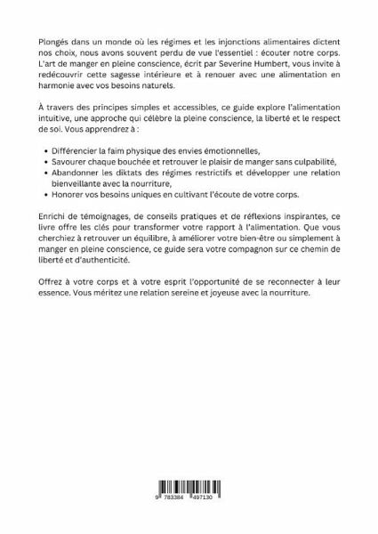 Plongés dans un monde où les régimes et les injonctions alimentaires dictent nos choix, nous avons souvent perdu de vue l'essentiel : écouter notre corps. L'art de manger en pleine conscience, écrit par Severine Humbert, vous invite à redécouvrir cette sagesse intérieure et à renouer avec une alimentation en harmonie avec vos besoins naturels.À travers des principes simples et accessibles, ce guide explore l'alimentation intuitive, une approche qui célèbre la pleine conscience, la liberté et le respect de soi. Vous apprendrez à :Différencier la faim physique des envies émotionnelles,Savourer chaque bouchée et retrouver le plaisir de manger sans culpabilité,Abandonner les diktats des régimes restrictifs et développer une relation bienveillante avec la nourriture,Honorer vos besoins uniques en cultivant l'écoute de votre corps.Enrichi de témoignages, de conseils pratiques et de réflexions inspirantes, ce livre offre les clés pour transformer votre rapport à l'alimentation. Que vouscherchiez à retrouver un équilibre, à améliorer votre bien-être ou simplement à manger en pleine conscience, ce guide sera votre compagnon sur ce chemin de liberté et d'authenticité.Offrez à votre corps et à votre esprit l'opportunité de se reconnecter à leur essence. Vous méritez une relation sereine et joyeuse avec la nourriture.