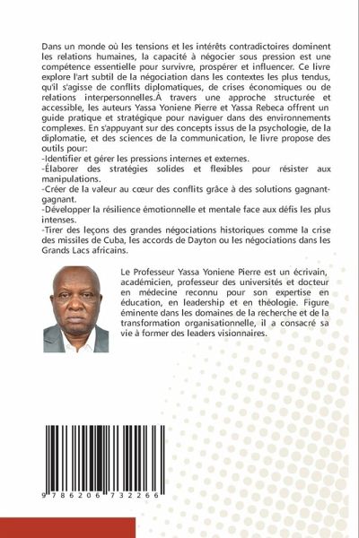 Dans un monde où les tensions et les intérêts contradictoires dominent les relations humaines, la capacité à négocier sous pression est une compétence essentielle pour survivre, prospérer et influencer. Ce livre explore l'art subtil de la négociation dans les contextes les plus tendus, qu'il s'agisse de conflits diplomatiques, de crises économiques ou de relations interpersonnelles.À travers une approche structurée et accessible, les auteurs Yassa Yoniene Pierre et Yassa Rebeca offrent un guide pratique et stratégique pour naviguer dans des environnements complexes. En s'appuyant sur des concepts issus de la psychologie, de la diplomatie, et des sciences de la communication, le livre propose des outils pour:-Identifier et gérer les pressions internes et externes.-Élaborer des stratégies solides et flexibles pour résister aux manipulations.-Créer de la valeur au coeur des conflits grâce à des solutions gagnant-gagnant.-Développer la résilience émotionnelle et mentale face aux défis les plus intenses.-Tirer des leçons des grandes négociations historiques comme la crise des missiles de Cuba, les accords de Dayton ou les négociations dans les Grands Lacs africains.