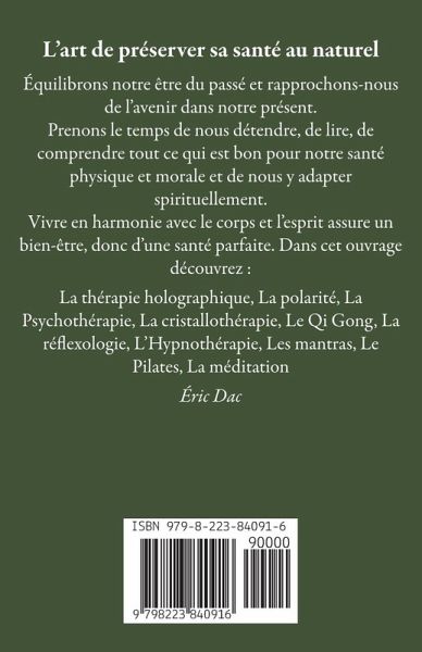 L'Art de préserver sa santé au naturel (tome 2) Êtes-vous prêt à infuser votre vie avec les secrets de la santé holistique ? Ne cherchez pas plus loin ! Nous avons juste la solution pour vous aider à atteindre un esprit et un corps équilibrés - « L'art de préserver sa santé au naturel. » Dans un monde où règnent le stress et le chaos, il est essentiel de prendre un moment et de se nourrir. Ce guide remarquable offre un trésor de sagesse pour vous aider à libérer votre véritable potentiel de bien-être physique et mental. Pas de gadgets, juste des conseils pratiques qui ont résisté à l'épreuve du temps ! « Équilibrons notre être du passé et nous rapprochons de l'avenir dans notre présent. » Comme le dit le dicton, « L'équilibre est la clé de tout. » Notre livre propose un éventail de techniques qui vous permettront de vivre en harmonie avec votre corps et votre esprit, menant à une santé et une vitalité optimale. À travers les pages de ce livre, vous explorerez une gamme de sujets fascinants tels que la thérapie holographique, la polarité, la psychothérapie, la cristallothérapie, le Qi Gong, la réflexologie, l'hypnothérapie, les mantras, le Pilates et la méditation. Chaque chapitre vous présentera une nouvelle dimension des soins personnels, en fournissant des informations et des conseils pratiques à intégrer dans votre routine quotidienne. Rappelez-vous le proverbe séculaire, « Un esprit sain réside dans un corps sain. » En investissant du temps dans votre bien-être, vous libérerez le véritable potentiel qui sommeille en vous. Laissez Eric Dac être votre guide dans ce voyage transformateur, alors qu'il partage son expertise et sa passion pour la santé holistique. Ne manquez pas cette opportunité de revitaliser votre vie naturellement, franchissez cette étape cruciale vers une existence plus saine et plus épanouie. N'oubliez pas que votre bien-être n'a pas de prix. Découvrez l'art de préserver votre santé naturellement et embarquez pour un voyage vers une personne plus heureuse et en meilleure santé ! Éric Dac