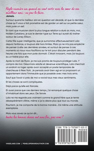 Vi Keeland et Penelope Ward, autrices de best-sellers au classement du New York Times, reviennent avec une nouvelle romance contemporaine standalone. Règle numéro un quand on veut sortir avec la sur de son meilleur ami : ne pas le faire. Jamais. Surtout quand le meilleur ami en question est décédé, et que la dernière chose qu'il vous a fait promettre est de garder un il sur sa petite sur, mais juste un il. En tant que musicien dont la plus longue relation a duré six mois, moi, Holden Catalano, je suis le dernier type sur Terre qui aurait dû traîner autour de Laney Ellison. Cette fille super intelligente, que je surnomme affectueusement Lala depuis l'enfance, a toujours été hors limites. Mais ça ne m'a pas empêché de penser à elle ces dernières années, et surtout de penser à ces moments où nous nous faufilions sur le toit pour discuter pendant des heures une fois que mon pote dormait. C'était innocent, mais j'ai toujours eu un faible pour elle. Après la mort de Ryan, je me suis promis de toujours protéger Lala. Y compris de moi. Désormais adulte et devenue scientifique, Lala cherchait un endroit où loger après avoir accepté un poste temporaire de chercheuse à New York. Je pensais avoir bien agi en lui proposant un appartement dans l'immeuble que je possède avec mes trois amis. Sauf que l'avoir si près de moi a ravivé tous mes vieux sentiments. Et les choses se sont compliquées. Déjà parce qu'elle est fiancée. Et aussi parce que ces derniers temps, j'ai remarqué quelque chose d'inhabituel dans ses yeux. De l'envie. Lala ne me regarde pas vraiment comme le grand frère que je tente désespérément d'être, même si je la désire plus que tout au monde. Pourtant, je me comporte de la bonne manière. J'ai même une attitude exemplaire. Mais vous savez ce qu'on dit... toutes les bonnes choses ont une fin, pas vrai ?