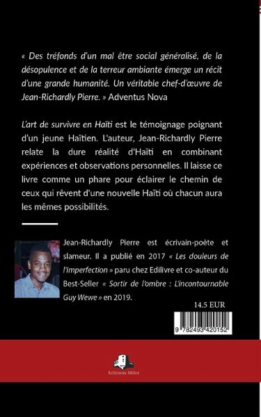 " Des tréfonds d'un mal-être social généralisé, de la désopulence et de la terreur ambiante émerge un récit d'une grande humanité. Un véritable chef-doeuvre de Jean-Richardly Pierre. " Adventus Nova L'art de survivre en Haïti est le témoignage poignant d'un jeune haïtien. L'auteur, Jean-Richardly Pierre relate la dure réalité d'Haïti en combinant expériences et observations personnelles. Il laisse ce livre comme un phare pour éclairer le chemin de ceux qui rêvent d'une nouvelle Haïti où chacun aura les mêmes possibilités.