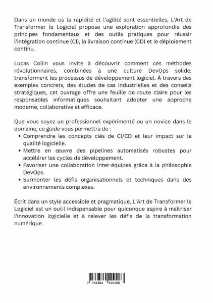 Dans un monde où la rapidité et l'agilité sont essentielles, L'Art de Transformer le Logiciel propose une exploration approfondie des principes fondamentaux et des outils pratiques pour réussir l'intégration continue (CI), la livraison continue (CD) et le déploiement continu.Lucas Collin vous invite à découvrir comment ces méthodes révolutionnaires, combinées à une culture DevOps solide, transforment les processus de développement logiciel. À travers des exemples concrets, des études de cas industrielles et des conseils stratégiques, cet ouvrage offre une feuille de route claire pour les responsables informatiques souhaitant adopter une approche moderne, collaborative et efficace.Que vous soyez un professionnel expérimenté ou un novice dans le domaine, ce guide vous permettra de :Comprendre les concepts clés de CI/CD et leur impact sur la qualité logicielle.Mettre en oeuvre des pipelines automatisés robustes pour accélérer les cycles de développement.Favoriser une collaboration interéquipes grâce à la philosophie DevOps.Surmonter les défis organisationnels et techniques dans des environnements complexes.Écrit dans un style accessible et pragmatique, L'Art de Transformer le Logiciel est un outil indispensable pour quiconque aspire à maîtriser l'innovation logicielle et à relever les défis de la transformation numérique.