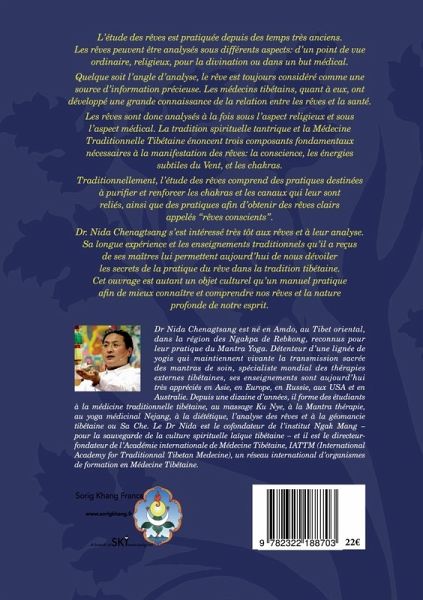 L'étude des rêves est pratiquée depuis des temps très anciens. Les rêves peuvent être analysés sous différents aspects: d'un point de vue ordinaire, religieux, pour la divination ou dans un but médical. Quelque soit l'angle d'analyse, le rêve est toujours considéré comme une source d'information précieuse. Les médecins tibétains, quant à eux, ont développé une grande connaissance de la relation entre les rêves et la santé. Les rêves sont donc analysés à la fois sous l'aspect religieux et sous l'aspect médical. La tradition spirituelle tantrique et la médecine tibétaine énoncent trois composants fondamentaux nécessaires à la manifestation des rêves: la conscience, les énergies subtiles du Vent et les chakras. Traditionnellement, l'étude des rêves comprend des pratiques destinées à purifier et renforcer les chakras et les canaux qui leur sont reliés, ainsi que des pratiques qui facilitent l'apparition des rêves clairs, ou rêves "conscients". Le docteur Nida Chenagtsang s'est intéressé très tôt aux rêves, aux siens à ceux de ses patients. Sa longue expérience et les enseignements traditionnels qu'il a reçus de ses maîtres lui permettent aujourd'hui de nous dévoiler les secrets de cette pratique ancienne. Cet ouvrage est autant un objet culturel qu'un manuel de pratique afin de mieux connaître et comprendre nos rêves et la nature profonde de notre esprit.