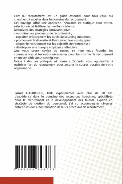 L'art du recrutement" est un guide essentiel pour tous ceux qui cherchent à exceller dans le domaine du recrutement.Cet ouvrage offre une approche innovante et pratique pour attirer, sélectionner et fidéliser les meilleurs talents.Découvrez des stratégies éprouvées pour :- optimiser vos processus de recrutement ;- exploiter efficacement les outils de sourcing modernes ;- promouvoir la diversité et l'inclusion dans vos équipes ;- aligner le recrutement sur les objectifs de l'entreprise ;- développer une marque employeur attractive.Que vous soyez novice ou expert, ce livre vous fournira les connaissances et les outils nécessaires pour transformer le recrutement en un véritable atout stratégique. Grâce à des cas pratiques et conseils d'experts, vous apprendrez à maîtriser l'art du recrutement pour assurer le succès durable de votre organisation.