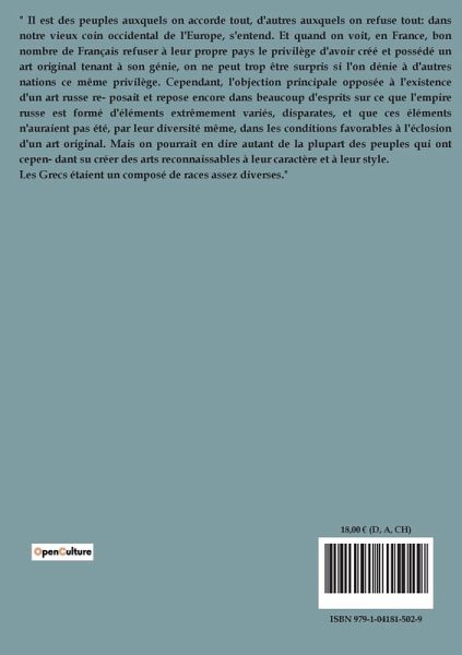 L'ouvrage "L'art russe" d'Eugène Viollet-le-Duc explore les origines, les éléments constitutifs, l'apogée et l'avenir de l'art russe. Viollet-le-Duc commence par souligner le passage des influences qui ont façonné l'art russe, citant les apports byzantins, slaves, scandinaves et asiatiques. Il met en avant l'idée que l'art russe, bien que souvent perçu comme une simple imitation de l'art byzantin, possède en réalité une originalité propre, issue de la fusion de ces diverses influences. L'auteur examine comment les Slaves et les Varègues, bien qu'initialement adeptes de la construction en bois, ont intégré des éléments de maçonnerie byzantine dans leurs édifices religieux, tout en conservant une ornementation distincte influencée par des traditions asiatiques et slaves. Viollet-le-Duc souligne également l'importance des manuscrits anciens qui témoignent de cette synthèse artistique sans équivalent. Il critique la tendance historique de la Russie à imiter les arts occidentaux, plaidant pour un retour aux sources et une réforme de l'art national. L'auteur conclut en affirmant que l'art russe, en renouant avec ses racines, peut retrouver sa place et son éclat sur la scène mondiale.
