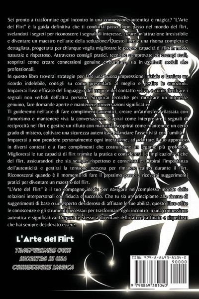 Sei pronto a trasformare ogni incontro in una connessione autentica e magica? "L'Arte del Flirt" è la guida definitiva che ti condurrà passo dopo passo nel mondo del flirt, svelandoti i segreti per riconoscere i segnali di interesse, creare un'attrazione irresistibile e diventare un maestro nell'arte della seduzione. Questo libro è una risorsa completa e dettagliata, progettata per chiunque voglia migliorare le proprie capacità di flirt in modo naturale e rispettoso. Attraverso consigli pratici, tecniche comprovate e esempi reali, scoprirai come creare connessioni genuine e durature, sia in contesti sociali che professionali. "L'Arte del Flirt" è il tuo compagno ideale per navigare nel complesso mondo delle relazioni interpersonali con fiducia e successo. Che tu sia un principiante alla ricerca di suggerimenti di base o un esperto desideroso di affinare le tue abilità, questo libro offre le conoscenze e gli strumenti necessari per trasformare ogni incontro in una connessione autentica e significativa. Prepara te stesso a diventare il flirtatore raffinato e rispettoso che hai sempre desiderato essere.