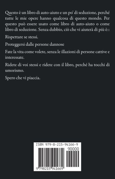 Questo è un libro di auto-aiuto e un po' di seduzione, perché tutte le mie opere hanno qualcosa di questo mondo. Per questo può essere usato come libro di auto-aiuto o come libro di seduzione. Senza dubbio, ciò che vi aiuterà di più è:: Rispettare se stessi. Proteggersi dalle persone dannose Fate la vita come volete, senza le illazioni di persone cattive e interessate. Ridete di voi stessi e ridete con il libro, perché ha tocchi di umorismo. Spero che vi piaccia.