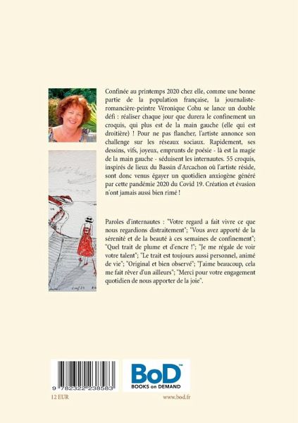 Confinée pendant 55 jours chez elle, comme une bonne partie de la population française, la créatrice Véronique Cohu se lance un double défi : réaliser chaque jour que durera le confinement un croquis, qui plus est de la main gauche (elle qui est droitière) ! Pour ne pas flancher (qui savait combien de temps durerait le confinement?), l'artiste annonce son challenge sur les réseaux sociaux. Rapidement, ses dessins, vifs, joyeux, emprunts de poésie - là est la magie de la main gauche - séduisent les internautes. 55 croquis, inspirés de lieux du Bassin d'Arcachon, sont donc venus égayer un quotidien anxiogène généré par cette pandémie 2020 du Covid 19. Une belle preuve que l'art peut aider à s'évader, même quand on est enfermé chez soi !