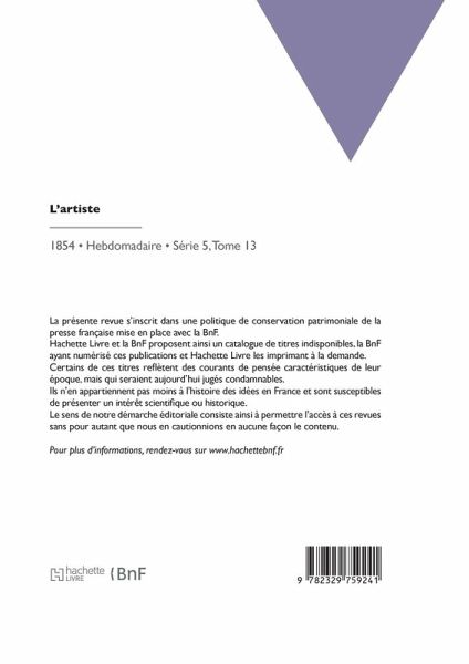L'Artiste: journal de la littérature et des beaux-arts Date de l'édition originale: 1854 La présente revue s'inscrit dans une politique de conservation patrimoniale de la presse française mise en place avec la BnF. Hachette Livre et la BnF proposent ainsi un catalogue de titres indisponibles, la BnF ayant numérisé ces publications et Hachette Livre les imprimant à la demande. Certains de ces titres reflètent des courants de pensée caractéristiques de leur époque, mais qui seraient aujourd'hui jugés condamnables. Ils n'en appartiennent pas moins à l'histoire des idées en France et sont susceptibles de présenter un intérêt scientifique ou historique. Le sens de notre démarche éditoriale consiste ainsi à permettre l'accès à ces revues sans pour autant que nous en cautionnions en aucune façon le contenu. Pour plus d'informations, rendez-vous sur www.hachettebnf.fr