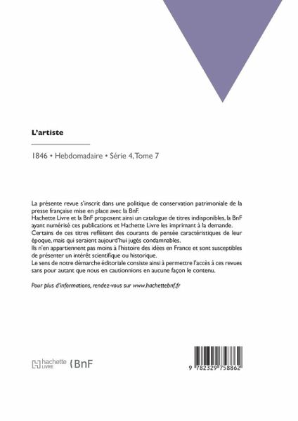 L'Artiste: journal de la littérature et des beaux-arts Date de l'édition originale: 1846 La présente revue s'inscrit dans une politique de conservation patrimoniale de la presse française mise en place avec la BnF. Hachette Livre et la BnF proposent ainsi un catalogue de titres indisponibles, la BnF ayant numérisé ces publications et Hachette Livre les imprimant à la demande. Certains de ces titres reflètent des courants de pensée caractéristiques de leur époque, mais qui seraient aujourd'hui jugés condamnables. Ils n'en appartiennent pas moins à l'histoire des idées en France et sont susceptibles de présenter un intérêt scientifique ou historique. Le sens de notre démarche éditoriale consiste ainsi à permettre l'accès à ces revues sans pour autant que nous en cautionnions en aucune façon le contenu. Pour plus d'informations, rendez-vous sur www.hachettebnf.fr