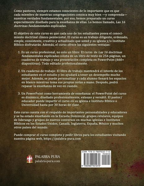 Basado en el libro de texto Las 16 doctrinas fundamentales explicadas, este cuaderno de trabajo es una herramienta sumamente útil para la impartición de clases en la iglesia local, así como en seminarios, institutos bíblicos, universidades cristianas, y en general por cualquier institución que imparta doctrina bíblica. Junto con este cuaderno de trabajo la editorial Palabra Pura ofrece un PowerPoint consistente en más de 650 diapositivas para ayudarle en su tarea educativa (para la impartición de un curso completo). Esta herramienta está disponible únicamente en nuestra página www.palabra-pura.com.