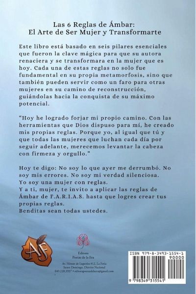 Dentro de cada mujer habita un fuego sagrado, una fuerza capaz de transformar cicatrices en alas y sueños en realidades. Las 6 Reglas de Ámbar: El Arte de Ser Mujer y Transformarte es la llave para despertar esa fuerza. Alexandra Farias comparte su viaje de transformación personal, entregándote seis reglas doradas que te enseñarán a renacer desde la fortaleza, la resiliencia, el amor y la inspiración. Cada palabra es un susurro al corazón, una invitación a creer en ti, a reconstruirte con valentía y a recordar que tu brillo no depende de las tormentas que has enfrentado, sino de la luz que siempre ha vivido dentro de ti. Este no es solo un libro; es un acto de amor hacia tu propia historia. Las 6 Reglas de Ámbar: Fortaleza: En tus raíces está el poder para resistir, crecer y brillar. Autoestima: Eres suficiente, eres valiosa, y mereces todo lo que sueñas. Resiliencia: Cada caída te reinventa; cada herida te hace más fuerte. Inspiración: Tu vida es un lienzo; pinta con el color de tu alma. Amor: El amor más grande comienza dentro de ti, en cada latido de tu ser. Sueños: No hay límites para lo que tu corazón se atreva a soñar y crear.