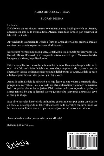 ICARO MITOLOGIA GRIEGA EL GRAN DILEMA La fabula: Dédalo era un arquitecto, artesano e inventor muy hábil que vivía en Atenas, aprendió su arte de la misma diosa Atenea, asiéndose famoso por construir el laberinto de Creta. Aprovechando la estancia de Dédalo e Ícaro en Creta, el rey Minos ordenó a Dédalo construir un laberinto para encerrar al Minotauro. Ícaro estaba retenido junto a su padre, Dédalo, en la isla de Creta por el rey de la isla, llamado Minos. Dédalo decidió escapar de la isla en secreto, pero Minos controlaba las aguas y la tierra, impidiendoselo. Estuvieron allí encerrados durante mucho tiempo. Desesperados por salir, se le ocurrió a Dédalo la idea de fabricar unas alas, con plumas de pájaros y cera de abejas, con las que podrían escapar volando del laberinto de Creta, Dédalo se puso a trabajar para fabricar alas para él y su hijo, Ícaro. Antes de salir, Dédalo le advirtió a su hijo Ícaro que no volara demasiado alto, porque si se acercaba al Sol, la cera de sus alas se derretiría y tampoco demasiado bajo porque las alas se les mojarían, Olvidándose de los consejos de su padre, se acercó tanto al Sol que se derritió la cera que sujetaba las plumas de sus alas, cayó al mar y se ahogó. Este libro narra las historias de un hombre en sus intentos por ganar un espacio en el cielo, de escapar de su laberinto, a través de la narrativa muestra todos los inconvenientes, limitaciones, tropiezos, acertijos, que afronto en su intento. .Fueron hechos reales que sucedieron en MI vida! ¡Gracias por leerlo!.......