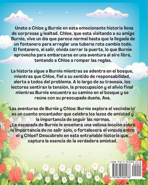 Únete a Chloe y Burnie en esta emocionante historia llena de sorpresas y lealtad. Chloe, que está visitando a su amigo Burnie, vive un día que parece normal hasta que la llegada de un fontanero para arreglar una tubería rota cambia todo. El fontanero, al salir, olvida cerrar la puerta, lo que Burnie aprovecha para embarcarse en una aventura al aire libre, tentando a Chloe a romper las reglas. La historia sigue a Burnie mientras se adentra en el bosque, mientras que Chloe, fiel a su sentido de responsabilidad, alerta a todos del problema. A lo largo de su travesía, los lectores sentirán la tensión, la preocupación y el alivio final mientras Burnie encuentra su camino en el bosque y se reúne con su preocupada dueña, Ava. "Las aventuras de Burnie y Chloe: Burnie explora el vecindario" es un cuento encantador que celebra los lazos de amistad y la importancia de seguir las normas. ¿La escapada de Burnie le enseñará una valiosa lección sobre la importancia de no salir solo, o fortalecerá el vínculo entre él y Chloe? Descúbrelo en esta entrañable historia que captura la esencia de la verdadera amistad.