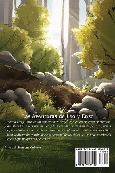 The Adventures of Leo and Enzo is a book of short stories for children ages 7 to 12 that will delight the whole family. It is inspired by the arrival of Leo, a round, bulging-eyed Shitzu, to a home in search of a four-legged love. This home can be any home every reader imagines, including their own. The book is narrated from Leo's perspective, allowing us to enter his mind and heart, helping us to see the world from the eyes of a little animal. It recounts the stages of Leo's growth at home, the arrival of Enzo, a Bernaisse puppy much bigger than him, and how he understands that he must strengthen his self-confidence to become a good big brother. Each short story has a positive message told through simple, everyday language. The little reader will experience fun adventures with Leo, Enzo, and the other animals that make up the Forest Tribe at home and in the garden outdoors. The book is a breath of fresh air needed today. It is a reminder that in every home, there are little animals and a bit of nature that can accompany our little readers as they dream and grow. The Adventures of Leo and Enzo help children:Accept themselves by gaining self-confidence and valuing themselves as they are. Learn that there are others different from them, who deserve respect and have value for who they are. Animals are living beings with feelings that communicate and deserve respect, care, and love. _________________________________________________________________________________________________________________________________________________ Las Aventuras de Leo y Enzo es un libro de cuentos cortos para niños de 7 a 12 años que deleitará a toda la familia. Está inspirado en la llegada de Leo, un Shitzu de ojos saltones y redondos, a un hogar en búsqueda de un amor cuatropatado. Este hogar, puede ser el hogar que imagine cada lector, incluyendo el suyo. El libro es narrado desde la perspectiva de Leo, permitiéndonos así, adentrarnos en su mente y corazón, ayudándonos a ver el mundo desde los ojos de un animalito. Cuenta las etapas de crecimiento de Leo en casa, la llegada de Enzo, un cachorro Bernaisse mucho más grande que él, y cómo comprende que debe fortalecer su confianza en él mismo para llegar a ser un buen hermano mayor. Cada cuento corto tiene un mensaje positivo contado a través de un lenguaje sencillo y cotidiano. El pequeño lector vivirá, no sólo de la mano de Leo y Enzo, sino también de los demás animales integrantes de la Tribu del Bosque, aventuras divertidas, tanto en casa como en el jardín de casa al aire libre. El libro es una brisa de aire fresco necesario hoy en día. Un recordatorio de que en todo hogar existen animalitos y un poco de naturaleza, que pueden acompañar a nuestros pequeños lectores a soñar y a crecer. Las Aventuras de Leo y Enzo ayuda a los niños a:Aceptarse ganando confianza en sí mismo y apreciarse tal como son. Aprender que hay seres diferentes a ellos, que merecen respeto y que tienen valor por como son. A entender que el miedo es normal, y que lo importante es no dejar que nos paralice. Que los animales son seres vivos con sentimientos, que se comunican y se merecen respeto, cuidado y amor.