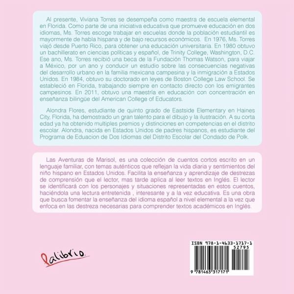 Las Aventuras de Marisol, es una colección de cuentos cortos escrito en un lenguaje familiar, con temas auténticos que reflejan la vida diaria y sentimientos del niño hispano en Estados Unidos. Facilita la enseñanza y aprendizaje de destrezas de comprensión que el lector, mas tarde aplica al leer textos en Inglés. El lector se identificará con los personajes y situaciones representadas en estos cuentos, haciéndola una lectura entretenida , interesante y a la vez educativa. Es una obra que busca fomentar la enseñanza del idioma español a nivel elemental a la vez que enfoca en las destreza necesarias para comprender textos académicos en Inglés.