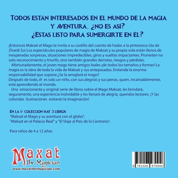 "Las Aventuras del Mago Maksat" ("The Adventures of Maxat the Magician") Collection 1 Written by Aijan Published in 2021 ISBN 978-1-008-97094-6 Are you ready for a whole new world of magic and adventure? Step into the enchanted island of Jardi-Su and meet Maxat the young magician, the star of this exciting and original series. Then Maxat the Magician invites you to his magic castle on the picturesque island of Jardi Su! Maxat's popular magic shows and his own life are full of unexpected surprises, unpredictable situations, shocking twists and turns. They promise not only recognition and triumph, but also great defeats, risks and losses. Fortunately, the young wizard has loyal friends of all shapes and sizes! Magic is the lifelong work of Maxat and his ancestors. He understands the enormous responsibility that comes with it. Will the magician handle it? After all, he is just a child, with his joys and sorrows, who is tirelessly learning the world. An exciting and original series is packed with adventure and fun and inspired by the timeless values of love and friendship. The pages are brought to life by bright, beautiful illustrations bound to delight all ages! "Las Aventuras del Mago Maksat" Colección 1 Escrito por Aizhan Publicado en 2021 ISBN 978-1-008-97094-6 Todos están interesados en el mundo de la magia y aventura, ¿no es así? ¿Estas listo para sumergirte en él? ¡Entonces Maksat el Mago te invita a su castillo del cuento de hadas a la pintoresca isla de Zhardi Su! Los espectáculos populares de magia de Maksat y su propia vida están llenos de inesperadas sorpresas, situaciones impredecibles, giros y vueltas impactantes. Prometen no solo reconocimiento y triunfo, sino también grandes derrotas, riesgos y pérdidas. Afortunadamente, el joven mago tiene amigos leales ¡de todos los tamaños y formas! La magia es la obra de toda la vida de Maksat y sus antepasados. Entiende la enorme responsabilidad que supone.¿Se la arreglará el mago? Después de todo, él es solo un niño, con sus alegrías y sus penas, quien, incansablemente, está aprendiendo el mundo. Una emocionante y original serie de libros sobre el Mago Maksat, les brindará, seguramente, una experiencia inolvidable y les llenará de alegría, queridos lectores. ¡Y las coloridas ilustraciones exitaran la imaginación! En la 1ª colección hay 3 libros: "Maksat el Mago y su aventura con un globo", "Maksat en el Palacio Real" y "Maksat en el Pais de lo Contrario". Para niños de 4 a 14 años