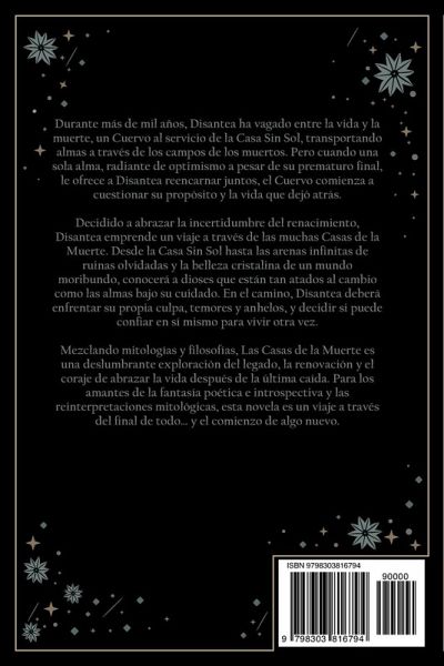 Durante más de mil años, Disantea ha vagado entre la vida y la muerte, un Cuervo al servicio de la Casa Sin Sol, transportando almas a través de los campos de los muertos. Pero cuando una sola alma, radiante de optimismo a pesar de su prematuro final, le ofrece a Disantea reencarnar juntos, el Cuervo comienza a cuestionar su propósito y la vida que dejó atrás. Decidido a abrazar la incertidumbre del renacimiento, Disantea emprende un viaje a través de las muchas Casas de la Muerte. Desde la Casa Sin Sol hasta las arenas infinitas de ruinas olvidadas y la belleza cristalina de un mundo moribundo, conocerá a dioses que están tan atados al cambio como las almas bajo su cuidado. En el camino, Disantea deberá enfrentar su propia culpa, temores y anhelos, y decidir si puede confiar en sí mismo para vivir otra vez. Mezclando mitologías y filosofías, Las Casas de la Muerte es una deslumbrante exploración del legado, la renovación y el coraje de abrazar la vida después de la última caída. Para los amantes de la fantasía poética e introspectiva y las reinterpretaciones mitológicas, esta novela es un viaje a través del final de todo... y el comienzo de algo nuevo.