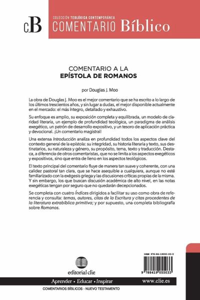 Uno de los mejores comentarios en existencia debido a su integridad, detalle y desarrollo exhaustivo de su contenido en el libro de Romanos. Su exposici¿¿n completa y equilibrada y el modelo de claridad literaria con profundidad teol¿¿gica brinda un paradigma de an¿¿lisis exeg¿¿tico con aplicaci¿¿n pr¿¿ctica y devocional. Se completa con cuatro ¿¿ndices dirigidos a facilitar su uso como obra de referencia y consulta: temas, autores, citas de la Escritura y citas procedentes de la literatura extrab¿¿blica primitiva; y por supuesto, una completa bibliograf¿¿a sobre Romanos. Este material expositivo se divide en 6 partes a lo largo del an¿¿lisis exeg¿¿tico: Introducci¿¿n general El coraz¿¿n del evangelio: La justificaci¿¿n por fe La seguridad que proporciona el evangelio: La esperanza de salvaci¿¿n La defensa del evangelio: El problema de Israel El poder transformador del evangelio: La conducta cristiana Conclusi¿¿n de la carta Igual que hace el ap¿¿stol en su ep¿¿stola, Moo expone las distintas posiciones de manera justa y clara para finalmente decantarse por una de ellas en particular, argumentando sus razones, convirti¿¿ndose en un recurso indispensable para el estudio de Pablo y su ep¿¿stola a los Romanos. The Epistle to the Romans One of the best commentaries in existence due to its completeness, detail, and exhaustive development of its content in the book of Romans. Its complete and balanced exposition and the model of literary clarity with theological depth provides a paradigm of exegetical analysis with practical and devotional application. It is complimented by four Indexes aimed at facilitating its use as a reference and reference work: themes, authors, Scripture quotations and quotations from early extra-biblical literature; and of course, a complete bibliography on Romans. This expository material is divided into 6 parts throughout the exegetical analysis: General introduction The heart of the gospel: Justification by faith. The assurance that the gospel provides: The hope of salvation. The defense of the gospel: The problem of Israel. The transforming power of the gospel: Christian conduct. Conclusion of the letter Just as the apostle does in his epistle, Moo exposes the different positions in a fair and clear way to finally opt for one of them, arguing his reasons, becoming an indispensable resource for the study of Paul and his epistle to the Romans.