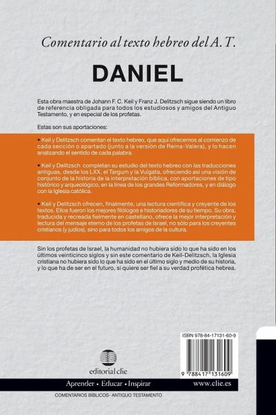 Daniel, comentario al texto hebreo del Antiguo Testamento por Carl Friedrich Keil y F. J. Delitzsch, En este comentario Biblico se profundiza en uno de los libros m¿¿s investigados, discutidos, estudiados de la Biblia, Daniel. Con sus terrores apocal¿¿pticos, pero tambi¿¿n con su inmensa esperanza, es uno de los textos m¿¿s influyentes y fascinantes de la historia de occidente. Donde de un modo general se han distinguido en la tradici¿¿n del libro cuatro elementos o rasgos: sapiencial, apocal¿¿ptico, hist¿¿rico y can¿¿nico-teol¿¿gico. Este es un libro apasionante, complejo y emocionante, ideal no s¿¿lo para los que est¿¿n interesados en un plano religioso, sino a los que buscan el sentido de la historia. Incluye: Fidelidad al texto en su rä¿z m¿¿s honda, en su "verdad Hebrea". Citas y comentarios de textos Hebreos y Arameos. Temas b¿¿sicos de sabidur¿¿a y apocal¿¿ptica. Comentarios y estudios sobre el libro de Daniel, desde varias perspectivas exeg¿¿ticas, teol¿¿gicas y eclesiales. Comentario en espä¿ol (Xabier Pizaka). Amplias referencias bibliogr¿¿ficas del tema. Recomendaciones de lectura para ampliar conocimiento del tema. Commentary on Daniel Commentary on Daniel by Carl Friedrich Keil and F. J. Delitzsch, This Biblical Commentary delves into one of the most researched, discussed, and studied books of the Bible, Daniel. With its apocalyptic terrors, but also with its immense hope, it is one of the most influential and fascinating texts in the West history. Where broadly four elements or traits have been distinguished in the tradition of the book: wisdom, apocalyptic, historical, and canonical-theological. This is a passionate, complex, and exciting book, ideal not only for those who are interested in a religious level, but those who are looking for a sense of history. It includes: Fidelity to the text in its deepest roots, in its "Hebrew truth". Quotes and comments from Hebrew and Aramaic texts. Basic wisdom and apocalyptic themes. Comments and studies on the book of Daniel, from various exegetical, theological, and ecclesial perspectives. Commentary in Spanish (Xabier Pizaka). Extensive bibliographic references on the subject. Reading recommendations to expand knowledge of the subject.