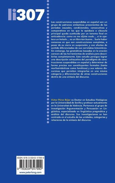 Las construcciones suspendidas en español son un grupo de patrones sintácticos provenientes de los períodos causales, condicionales, consecutivos y comparativos en los que la apódosis o cláusula principal queda sustituida por un tonema final en anticadencia: como no me dijiste nada..., si te apetece un helado..., es un libro tan bueno... Suele haber consenso en que son construcciones completas, a pesar de su cierre en suspensión, y con efectos de sentido diferenciados de sus correlatos bimembres. Sin embargo, las gramáticas basadas en la oración carecen de las herramientas de análisis para describirlas completamente. Este estudio persigue lograr una descripción exhaustiva del paradigma de construcciones suspendidas en español y determinar de forma precisa sus constituyentes formales (tanto morfosintácticos como fonéticos) y sus valores discursivos que permiten integrarlas en una misma categoría y diferenciarlas de otras construcciones dentro de una sintaxis del discurso.