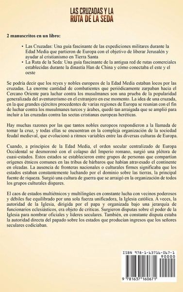 2 manuscritos completos en 1 libroLas Cruzadas: Una guía fascinante de las expediciones militares durante la Edad Media que partieron de Europa con el objetivo de liberar Jerusalén y ayudar al cristianismo en Tierra Santa La Ruta de la Seda: Una guía fascinante de la antigua red de rutas comerciales establecidas durante la dinastía Han de China y cómo conectaba el este y el oeste Se podría decir que los reyes y nobles europeos de la Edad Media estaban locos por las cruzadas. La enorme cantidad de combatientes que periódicamente zarpaban hacia el Cercano Oriente para luchar contra los musulmanes son una prueba de la popularidad generalizada del aventurerismo en el extranjero en ese momento. La idea de una cruzada, en la que grandes ejércitos procedentes de varias regiones de Europa se reunían con el fin de luchar contra los musulmanes turcos y árabes, quedó tan arraigada que se amplió para incluir a las cruzadas contra las sectas cristianas europeas heréticas. La primera parte de este libro incluye:La Primera Cruzada (1095-1099) - El Papa llama a los fieles a las armas Los Ejércitos de la Primera Cruzada se Enfrentan al Enemigo Las Secuelas de la Primera Cruzada La Segunda Cruzada (1147-1149) Los comienzos del Reino de Jerusalén La Tercera Cruzada (1189-1192) - La Cruzada del Rey La Cuarta Cruzada (1202-1204) - El Imperio Latino de Constantinopla y la Cruzada de los Niños La Quinta Cruzada (1217-1221) La Sexta Cruzada (1228) - El Santo Emperador Romano Federico II Toma la Cruz La Séptima Cruzada (1248-1254) La Octava Cruzada (1270) ¡Y mucho, mucho más! Segunda parte de este libro, usted:Roma, la seda y la geografía antigua La producción y el comercio de la seda Han El Reino de Loulan Los budistas a lo largo de la Ruta de la Seda Turfán: Un oasis en la Ruta de la Seda La leyenda del Preste Juan Gengis Kan, Gobernante de todo el mundo El Señor de Xanadú, Kublai Kan: El emperador de China Marco Polo visita la China de Kublai Kan Los últimos años de Kublai Kan ¡Y mucho, mucho más! ¡Obtenga este libro ahora para aprender más sobre Las Cruzadas y La ruta de la seda!