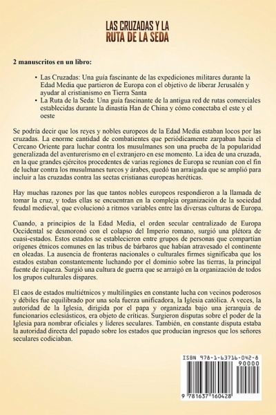 2 manuscritos completos en 1 libroLas Cruzadas: Una guía fascinante de las expediciones militares durante la Edad Media que partieron de Europa con el objetivo de liberar Jerusalén y ayudar al cristianismo en Tierra Santa La Ruta de la Seda: Una guía fascinante de la antigua red de rutas comerciales establecidas durante la dinastía Han de China y cómo conectaba el este y el oeste Se podría decir que los reyes y nobles europeos de la Edad Media estaban locos por las cruzadas. La enorme cantidad de combatientes que periódicamente zarpaban hacia el Cercano Oriente para luchar contra los musulmanes son una prueba de la popularidad generalizada del aventurerismo en el extranjero en ese momento. La idea de una cruzada, en la que grandes ejércitos procedentes de varias regiones de Europa se reunían con el fin de luchar contra los musulmanes turcos y árabes, quedó tan arraigada que se amplió para incluir a las cruzadas contra las sectas cristianas europeas heréticas. La primera parte de este libro incluye:La Primera Cruzada (1095-1099) - El Papa llama a los fieles a las armas Los Ejércitos de la Primera Cruzada se Enfrentan al Enemigo Las Secuelas de la Primera Cruzada La Segunda Cruzada (1147-1149) Los comienzos del Reino de Jerusalén La Tercera Cruzada (1189-1192) - La Cruzada del Rey La Cuarta Cruzada (1202-1204) - El Imperio Latino de Constantinopla y la Cruzada de los Niños La Quinta Cruzada (1217-1221) La Sexta Cruzada (1228) - El Santo Emperador Romano Federico II Toma la Cruz La Séptima Cruzada (1248-1254) La Octava Cruzada (1270) ¡Y mucho, mucho más! Segunda parte de este libro, usted:Roma, la seda y la geografía antigua La producción y el comercio de la seda Han El Reino de Loulan Los budistas a lo largo de la Ruta de la Seda Turfán: Un oasis en la Ruta de la Seda La leyenda del Preste Juan Gengis Kan, Gobernante de todo el mundo El Señor de Xanadú, Kublai Kan: El emperador de China Marco Polo visita la China de Kublai Kan Los últimos años de Kublai Kan ¡Y mucho, mucho más! ¡Obtenga este libro ahora para aprender más sobre Las Cruzadas y La ruta de la seda!