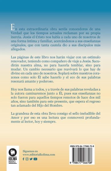 En esta extraordinaria obra seréis conocedores de una Verdad que los tiempos actuales reclaman por su propia inercia. Jesús el Cristo nos habla a cada uno de nosotros de una forma íntima y familiar, acercándonos a sus enseñanzas originales, que con tanta cautela dio a sus discípulos más allegados. Las páginas de este libro nos harán viajar con un estímulo renovador, teniendo como compañero de viaje a Jesús. Sacudirán nuestra alma, no para hacerla temblar, sino para mudar. Un cambio necesario que reavivará lo que hay de divino en cada uno de nosotros. Soplará sobre nuestros corazones como solo Él sabe hacerlo y el eco de sus palabras resonará amante y poderoso. Hoy nos llama a todos, y a través de sus palabras reveladas a la autora caminaremos junto a Él, pues sus enseñanzas, no solo fueron para aquellos tiempos remotos de hace dos mil años, sino también para este presente, que espera el regreso, tan aclamado, del Hijo del Hombre. La grandeza de esta obra lleva consigo el sello ineludible del Amor, y por eso es una lectura que conmoverá profundamente al lector, hoy y siempre.