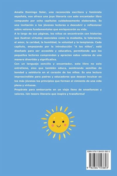 Amalia Domingo Soler, una reconocida escritora y feminista española, nos ofrece una joya literaria con este encantador libro compuesto por ocho capítulos cuidadosamente elaborados. Es una invitación a los jóvenes lectores a descubrir y reflexionar sobre valores fundamentales que enriquecerán su vida. A lo largo de sus páginas, los niños se encontrarán con historias que ilustran virtudes esenciales como la modestia, la tolerancia, el amor, la caridad, la humildad, la voluntad y la templanza. Cada capítulo, empezando por la introducción "A los niños", está diseñado para ser accesible y educativo, permitiendo que los pequeños lectores comprendan y aprecien estos valores de una manera divertida y significativa. Con un lenguaje sencillo y encantador, este libro no solo entretiene, sino que también educa, sembrando semillas de bondad y sabiduría en el corazón de los niños. Es una lectura imprescindible para padres y educadores que desean inculcar en los más jóvenes los principios que forman el cimiento de una vida plena y virtuosa. Prepárate para embarcarte en un viaje lleno de enseñanzas y valores. ¡Un tesoro literario que inspira y transforma!